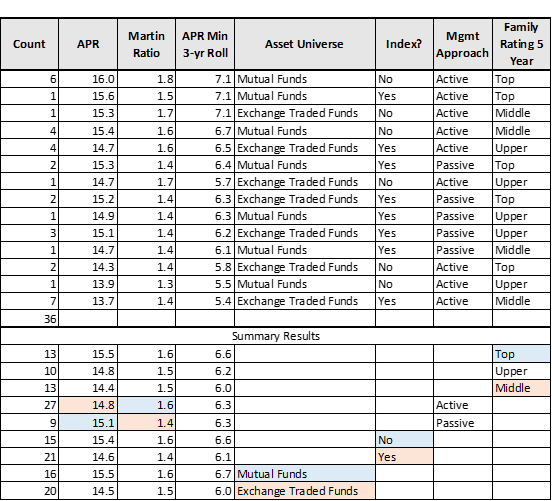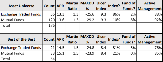 I eliminate funds with Three Alarm Fund Ratings, above-average Ulcer Ratings, and below average APR, MFO Ratings, Lipper Preservation Ratings, and Fund Family Ratings, as well as those with very high minimum required initial investments. This produces fifty-four funds summarized in Table #4. The refined list has a slightly higher APR and Martin Ratio (risk-adjusted return) with a slightly lower maximum drawdown. We can conclude that most of the mutual funds are not index funds and use an active management approach. Most of the exchange traded funds are index funds that use an active management approach.