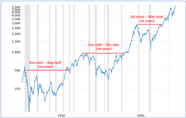 Figure #1 shows the S&P 500 for the past hundred years adjusted for inflation. A dollar in 2007 would have 31% more purchasing power than a dollar in 2024 due to inflation. The chart does not include the benefits of dividends. Dividends have largely been replaced by stock buybacks since the mid-2000s and were further lowered by easy monetary policy. The DQYDJ calculator can be used to estimate the return of the S&P 500 with dividends and adjusted for inflation for the twenty-six-year period from January 1966 to December 1991 to be 3.8% and for the sixteen years from July 2000 to May 2016 to be just under 2.0%.