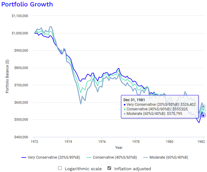 Investment data back to 1970 is limited. I set up Portfolio Visualizer for three portfolios starting with one million dollars in 1972 and 4% withdrawals spread monthly as shown in Figure #4. Allocations to the US Stock Market range from Very Conservative with 20% to Moderate with 60%. All three model portfolios ended with over $1.2 million nominal dollars at the end of 1981, but with less than $600,000 when adjusted for inflation. The purchasing power of withdrawals in 1981 were more than 40% lower than in 1972. Allocating 10% to gold equity instead of stocks would have improved the inflation-adjusted returns over the ten years by approximately 25%.