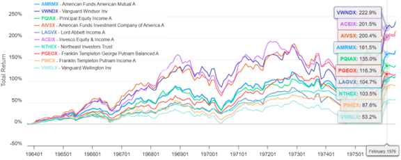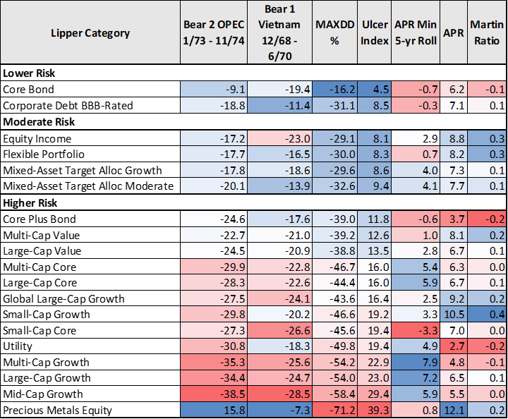 There are 96 mutual funds still in existence since 1964. The data in Table #1 covers the October 1964 to September 1974 time period. Fixed income performed as well as stocks but without the major drawdowns inflicting anxiety. Mixed-asset funds that benefited from rebalancing also performed well. Precious metals equity did the best for total return but with much higher volatility.