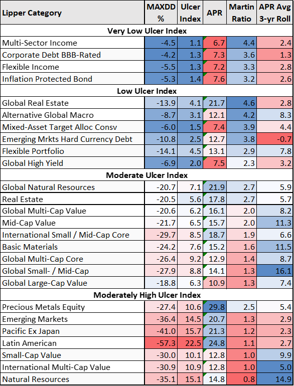 Table #1 shows some of the best-performing Lipper Categories during the Dotcom full cycle from September 2000 to October 2007. For comparison purposes, over the full cycle, the Ulcer Index of the S&P 500 was 22, the annualized percent return was 1.9%, and the Martin Ratio was -0.1. The Ulcer Index measures risk as the depth and length of drawdowns, and the Martin Ratio is a measure of risk-adjusted returns.