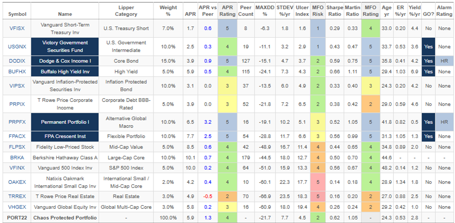 I created an all-weather portfolio for the past twenty-five years as shown in Table #2. There is a tradeoff between risk and return. A younger me aggressively invested one hundred percent in stocks, while an older and more conservative me now holds a traditional 60% stock to 40% bond allocation based on matching withdrawal needs with time horizons using the Bucket Approach. The Chaos Protected Portfolio reflects my personal biases that one should maintain diversified portfolios, and in the coming decade, I expect bonds to perform better than stocks on a risk-adjusted basis. The Chaos Protected Portfolio would have returned 5.9% with a maximum drawdown of 22% over the past twenty-five years compared to a return of 10% for the S&P 500 with a maximum drawdown of 51%. MFO Risk for the Chaos Protected Portfolio is estimated to be “2” for Conservative, and the APR rating is Above Average.