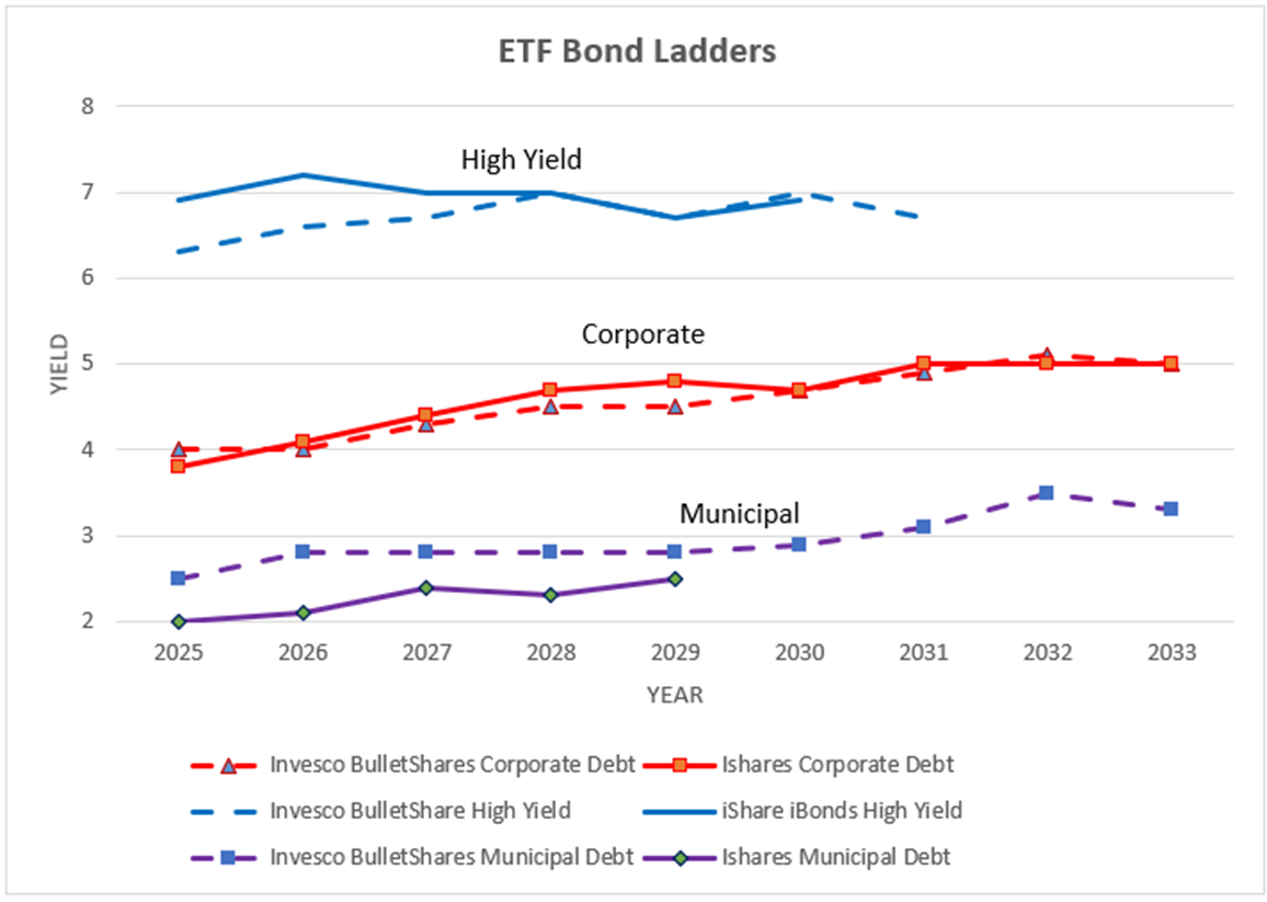 For a great article on Bond Ladder ETFs, I refer you to Bond Ladder ETFs Can Help Investors Climb Higher at Morningstar by Saraja Samant. Defined-maturity ETFs buy bonds that mature in the year the ETF terminates, returning its proceeds to investors. Ms. Samant shows an example of how ladders built with iShares iBond and Invesco BulletShares would have performed against an aggregate bond fund.