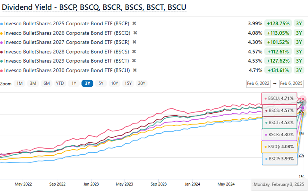 Figure #3 shows the dividend yield for the past three years from FinanceCharts for the Invesco Corporate Bond BulletShares with maturities from 2025 through 2030. Now is probably a good time to begin locking in higher yields.