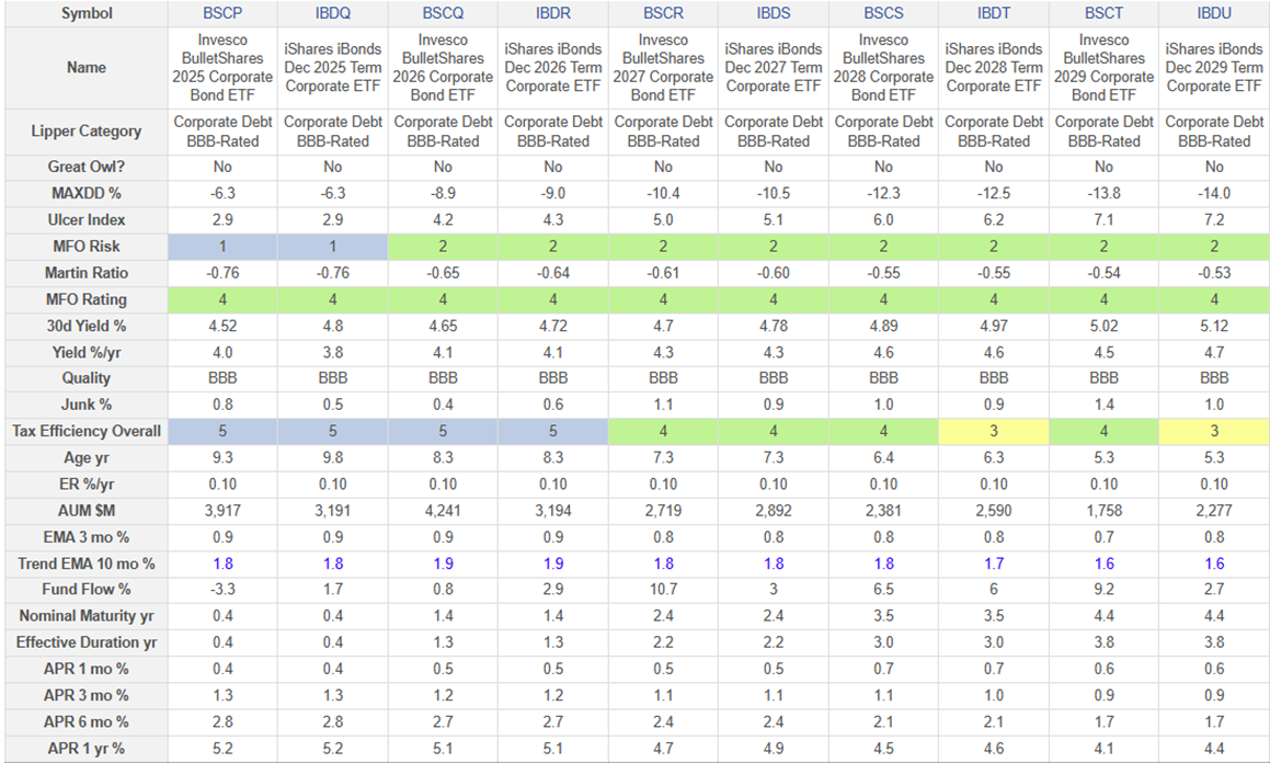 Table #2 provides a summary table comparing Invesco Bulletshares and iShares iBonds in the Corporate Debt BBB-Rated Lipper Bond Category. It is remarkable how similarly the Bulletshares and iBonds perform. I would be comfortable with either. During the past year, these funds have returned 4.1% to 5.2% and currently yield between 4.5% and 5.3%.