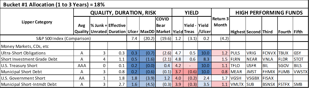 I currently have about 18% of my investment in fixed income located in Bucket #1. Bond funds that are suitable for Bucket #1 (Safety) have both high-quality debt and short duration. I include short-duration investment grade bonds because the risk of drawdown is relatively low, but the yields are higher than Treasury bills. Over the past three months, the top five funds in the six Lipper Categories that I include in Bucket #1 have returned about 1 to 2% over the past three months. I show the five funds that my Ranking System rates the highest.