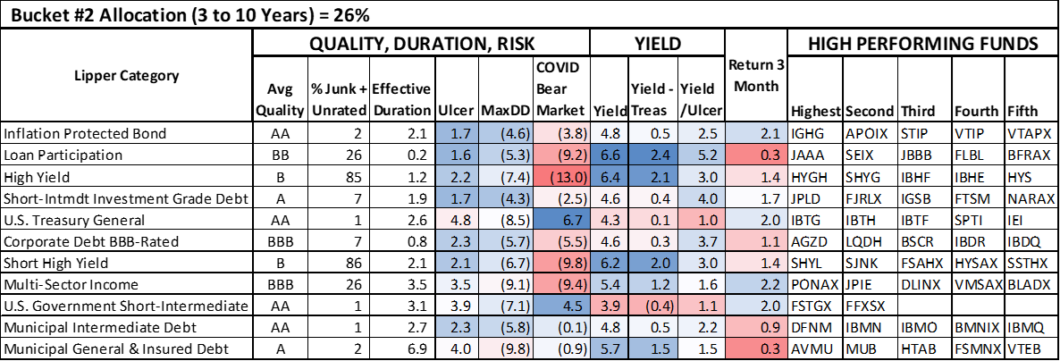 Bucket #2 is the most interesting to me because risks are moderate as measured by the Ulcer Index, and yields are favorable. I have about 26% of my investments in fixed income allocated to Bucket #2 Lipper Categories, plus another 18% in bond ladders.