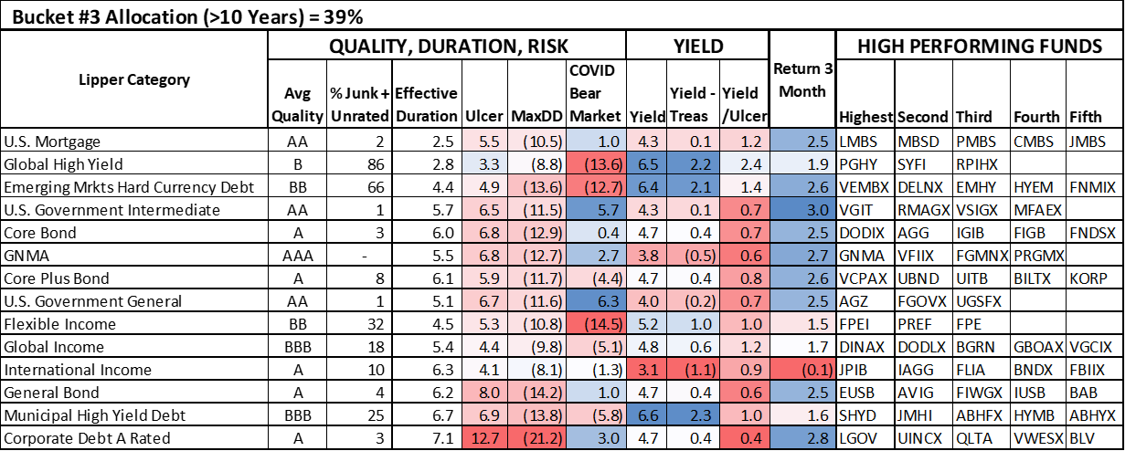 I currently have about 39% of my investments in fixed income allocated to Bucket #3 Lipper Categories. I am overweight in Traditional IRAs and consider them to be in Bucket #2 because of required minimum distributions. Some of the bond categories in Bucket #3 appear in my more aggressive Traditional IRA Bucket #2 sub-portfolios.