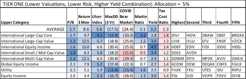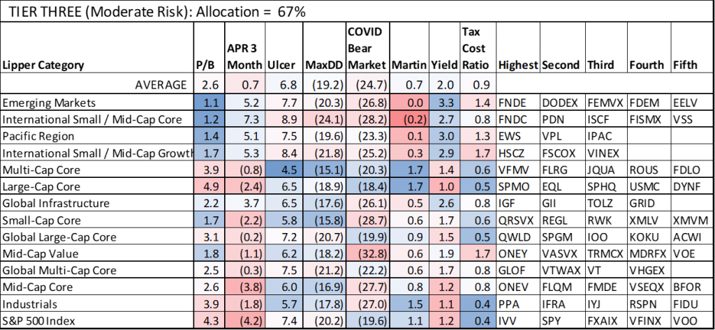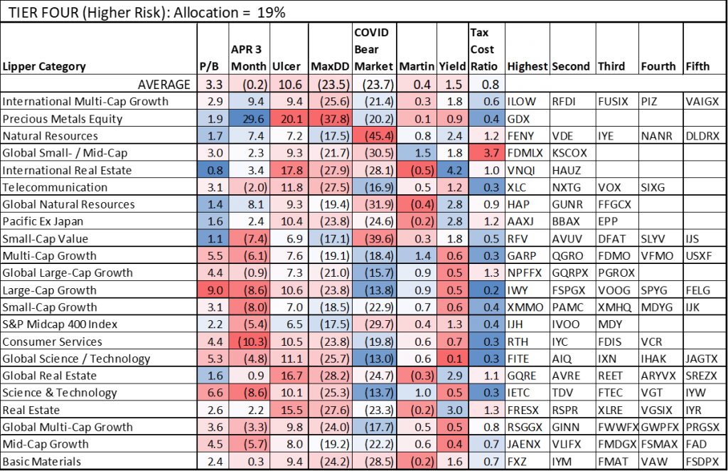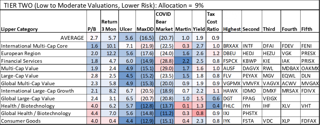 Tier Four equity funds tend to have a high Ulcer Index value. Valuations and drawdowns vary widely. Many are funds that one may want to use to tactically invest through the business cycle. I have 19% of my allocation to equities in the Tier Four categories, mostly in International Multi-Cap Growth, which are performing well now.