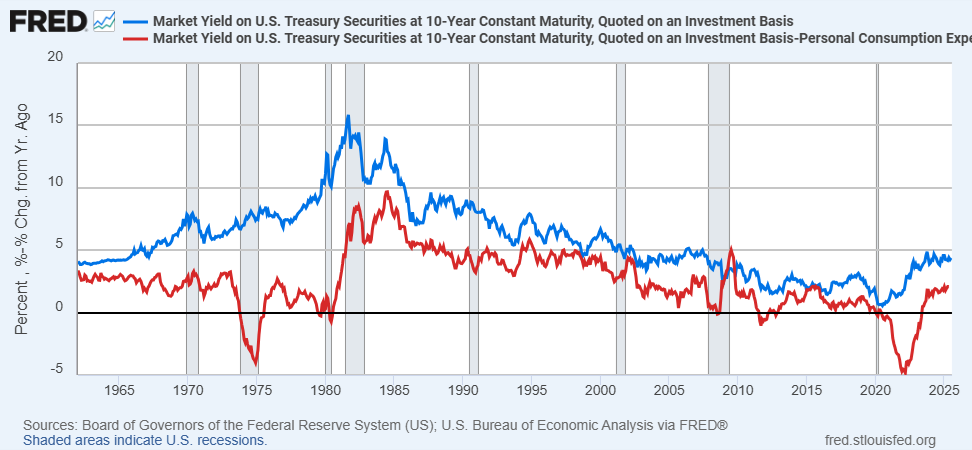 The yield on the US 10-year Treasury rose dramatically during the 1960s and 1970s, as a result of inflation, and fell to extremely low levels following the financial crisis as a result of Quantitative Easing and easy monetary policy. Figure #2 shows the yield on the 10-year Treasury along with the real yield as measured by subtracting the year-over-year changes in the personal consumption expenditures price index.