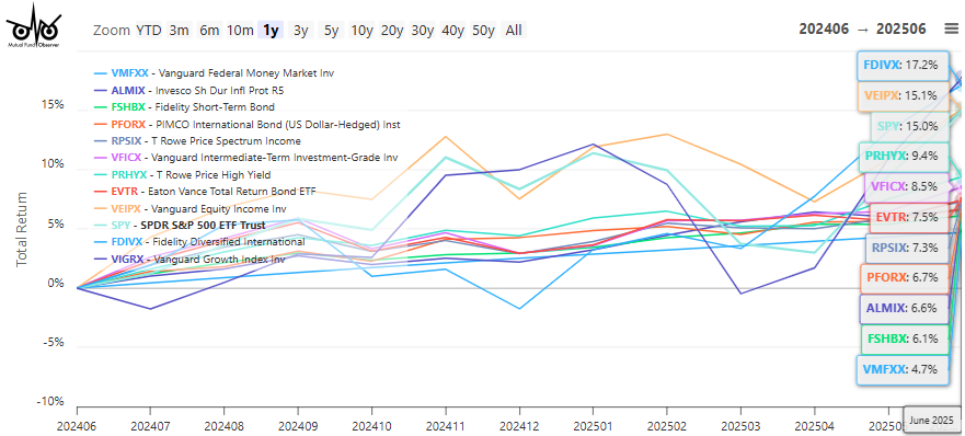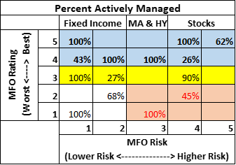 In summary, my portfolio is well diversified without much in higher-risk funds (MFO Risk = 5). The funds with below-average MFO ratings are mostly money market funds and short-term bond funds, which don’t concern me.