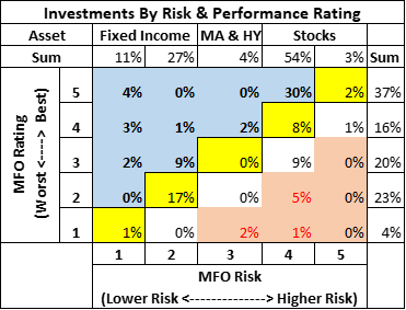 Below is my portfolio segmented by MFO Risk Rating and MFO Performance Rating for risk-adjusted returns, excluding about 10% that is mostly in bond ladders. The blue shaded area represents funds that have a higher MFO Performance Rating than Risk Rating. Over half of my funds by allocation fall into this sweet spot. The yellow shaded area has an MFO Performance Rating equal to the MFO Risk rating. I expect these to be mostly passively managed index funds. Nearly a third of my portfolio is allocated to the yellow shaded areas. The red shaded area represents allocations to funds that have a lower risk-adjusted performance rating than the MFO Risk. These are mostly international funds that had below-average risk-adjusted performance over the past three years but have done great year-to-date.